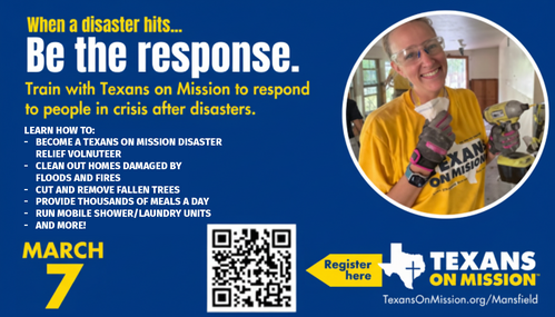 When disaster strikes, hope can arrive through you. Join Texans on Mission training on March 7 and learn how to bring help, healing, and the love of Christ to people in crisis. Click the button to sign up and be ready to respond when it matters most.