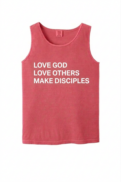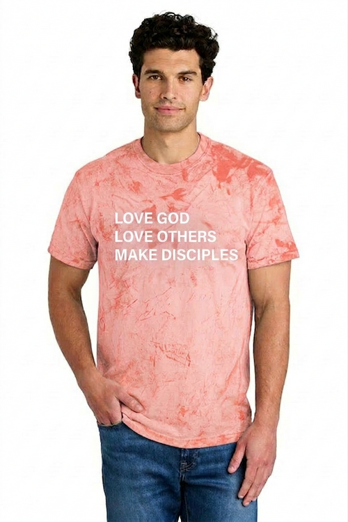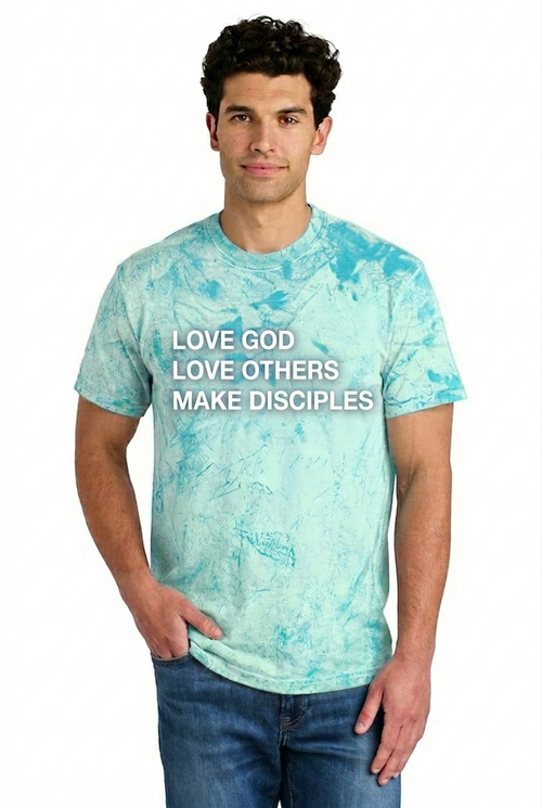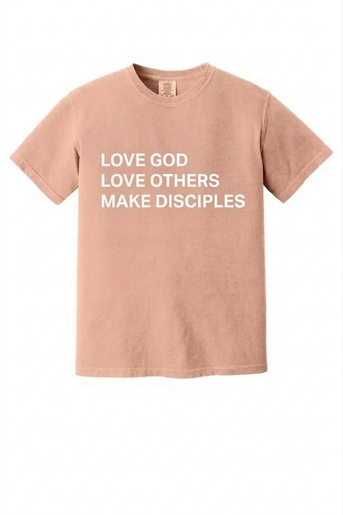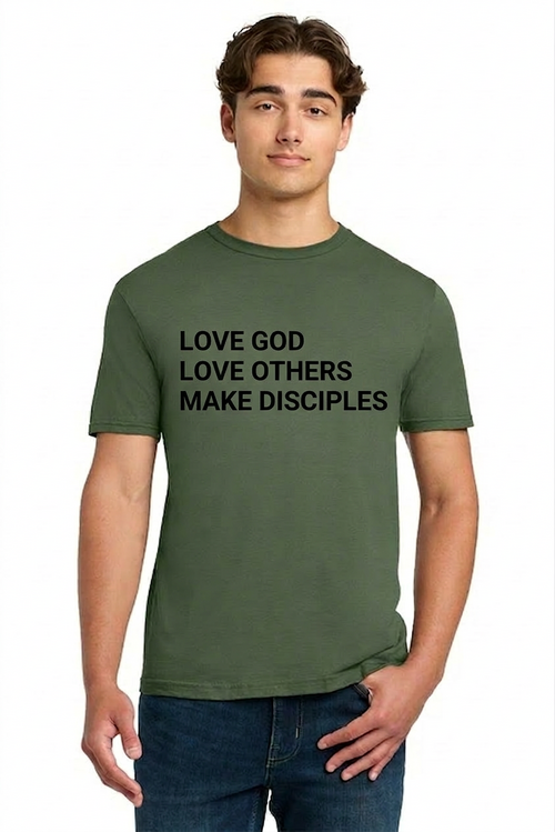 All size options will have "Love God, Love Others, Make Disciples" in white on the front and the WRBC Logo on the back.
